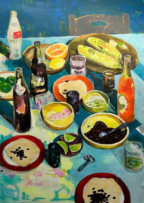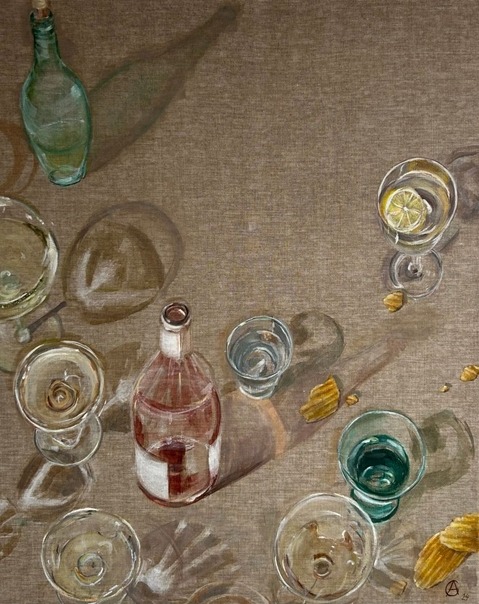 Die Darstellung des gedeckten Tisches als Sinnbild für Gemeinschaft und Vergänglichkeit bildet den zentralen Fokus dieser Arbeit. Stillleben werden nicht nur als perfekt arrangierte Kompositionen inszeniert, sondern auch in Momenten des Gebrauchs gezeigt – mit Flecken, halbvollen Gläsern und verstreuten Krümeln, die von gelebten Augenblicken zeugen. Besonders die Darstellung von Glas und Glasflaschen, mit ihrer Transparenz und Lichtbrechung, eröffnet eine spannende malerische Auseinandersetzung.